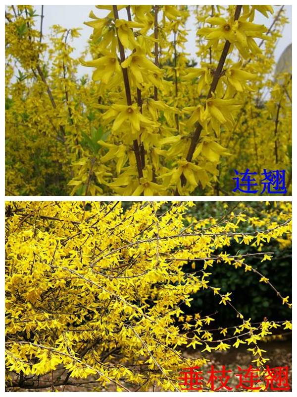 垂枝連翹:垂枝連翹是連翹的變種,跟連翹非常的相似,,一般的連翹枝條生長的都比較直立,只不過枝條比較柔軟纖細呈下垂狀態(tài),它的花期在3-5月,果期在7-9月。